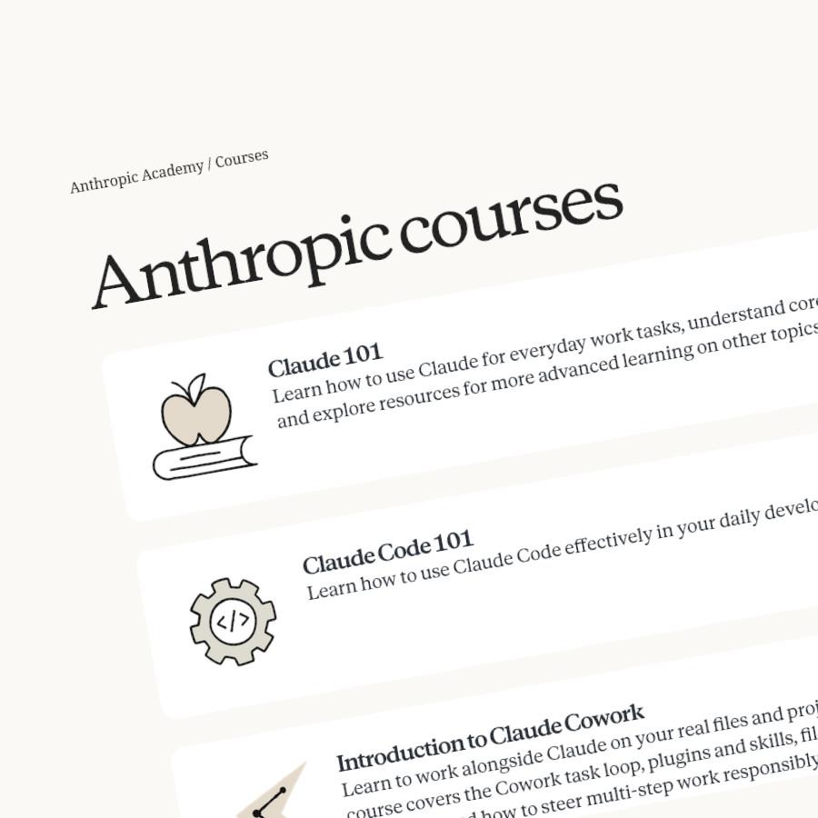 Plataforma de cursos oficiales de Anthropic (Anthropic Academy), donde se ofrecen cursos gratuitos sobre Claude y sus herramientas. El catálogo incluye desde introductorios como Claude 101 y AI Fluency hasta cursos técnicos avanzados como Building with the Claude API, Introduction to Model Context Protocol, Claude Code in Action, e integraciones con Amazon Bedrock y Google Vertex AI.