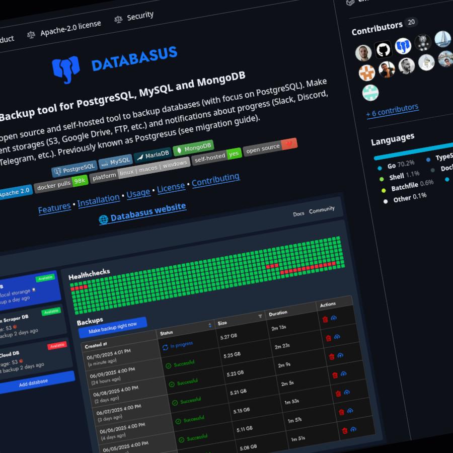 Databasus es una herramienta gratuita, de código abierto y alojada por el usuario para realizar copias de seguridad de bases de datos (con especial atención en PostgreSQL). Permite realizar copias de seguridad con diferentes almacenamientos (S3, Google Drive, FTP, etc.) y recibir notificaciones sobre el progreso (Slack, Discord, Telegram, etc.). Anteriormente conocida como Postgresus (consulta la guía de migración).