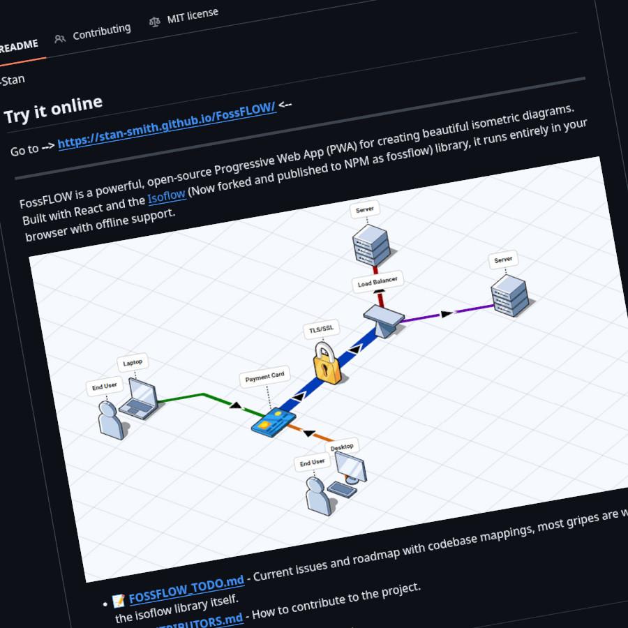 FossFLOW es una potente aplicación web progresiva (PWA) de código abierto para crear atractivos diagramas isométricos. Desarrollada con React y la biblioteca Isoflow (ahora bifurcada y publicada en NPM como fossflow), se ejecuta completamente en el navegador y funciona sin conexión.