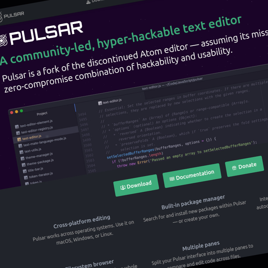 Pulsar es una bifurcación del editor Atom, que ya no se fabrica, y asume su misión de ser una combinación sin concesiones de hackabilidad y usabilidad.